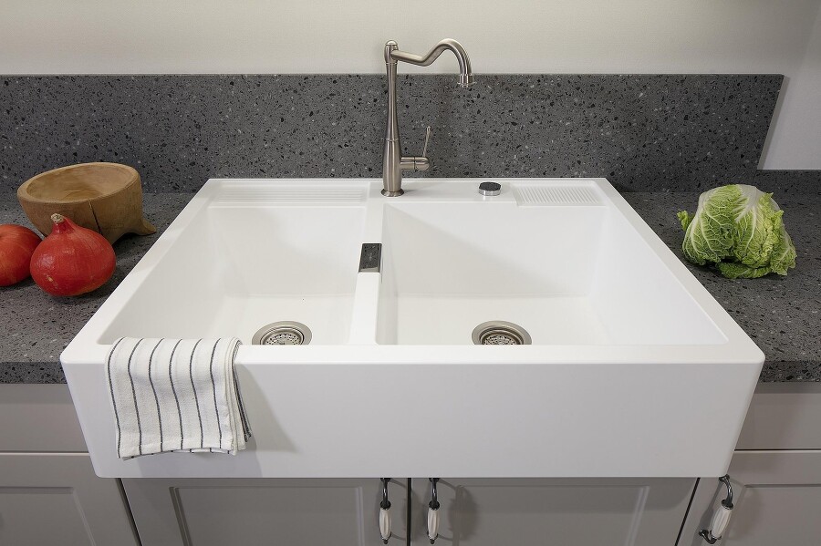 So ein Spülstein ist nicht ohne Grund ein Markenzeichen traditioneller Landhausküchen. Er ist für das Landleben wie geschaffen, da unerschütterlich. Allein Stöße großen Kochgeschirrs nimmt er ohne Schäden hin. Der abgebildete Spülstein ist aber nicht, wie man vermuten könnte, aus Keramik, sondern aus Cristadur, einem Quarzkomposit. Gefertigt aus natürlichem Quarz, dem härtesten Bestandteil von Granit, bringt er beste Voraussetzungen mit, um in der Küche lange Freude zu machen. Sie können ihn buchstäblich mit der Drahtbürste schrubben – er verträgt so ziemlich alles. Außer in Weiß bekommen Sie ihn noch in vielen anderen Farben!